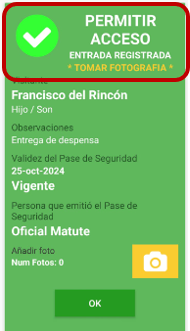 En el dispositivo, se mostrará la pantalla de PERMITIR ACCESO, muy similar a la que muestra al leer un código QR valido. Así también, el residente recibirá una notificación emergente, avisando del ingreso.
